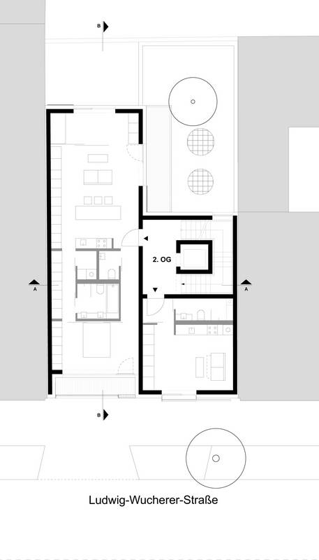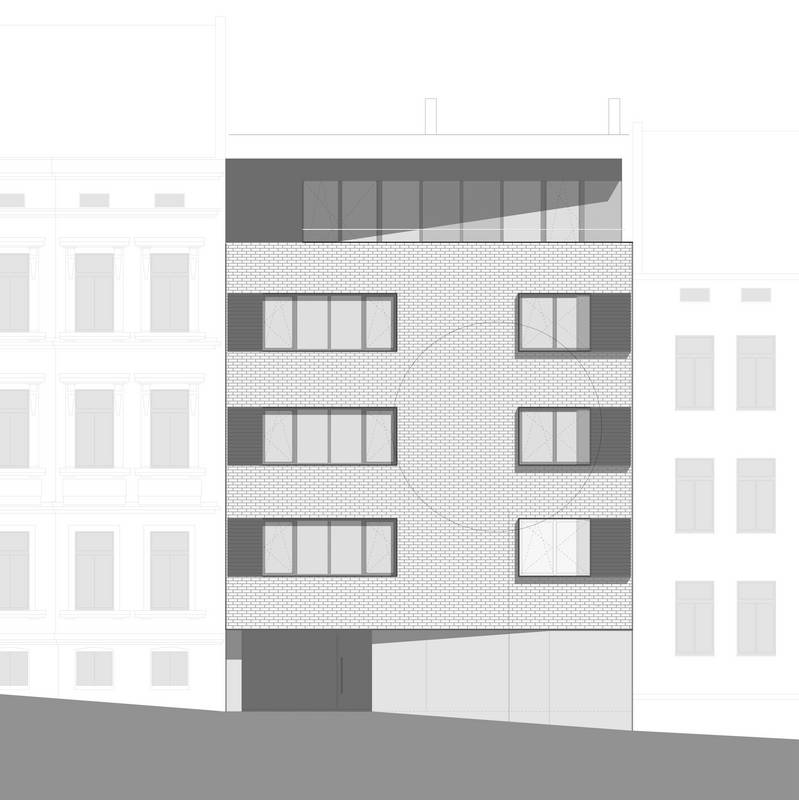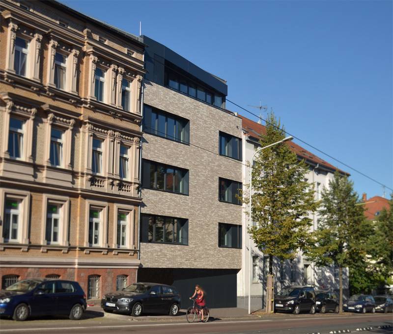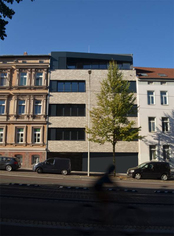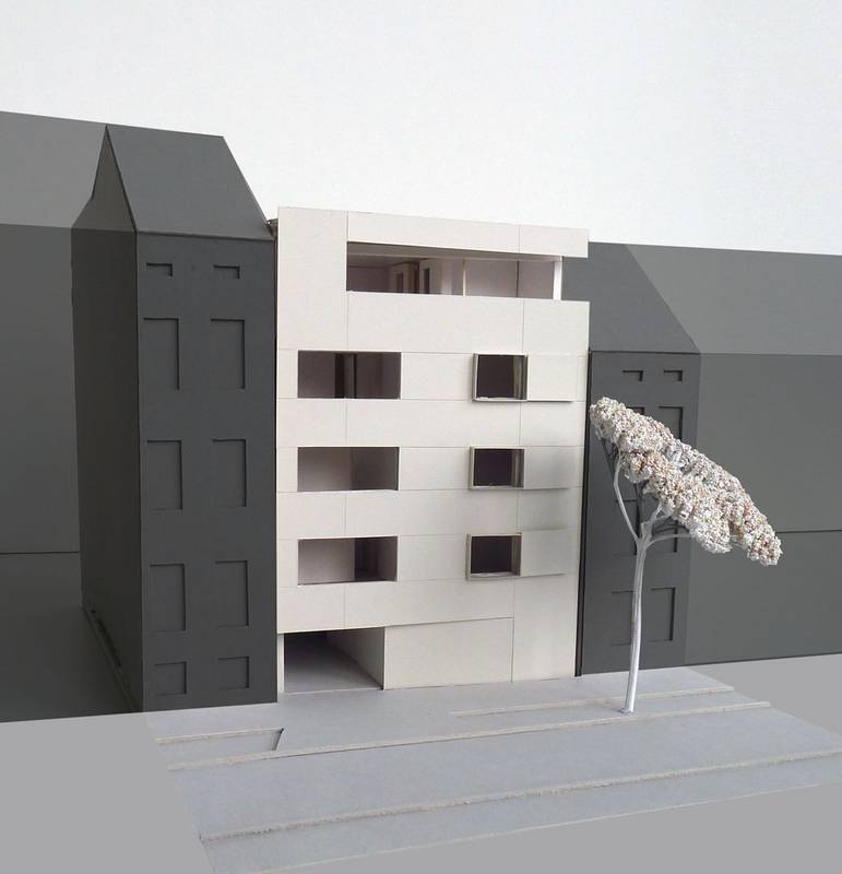 Unter maximaler Ausnutzung der baurechtlichen Situation und unter Berücksichtigung von Belichtung, Straßenlärm und Parksituation fügt sich das Mehrfamilienhaus mit fünf Wohneinheiten spannungsvoll in das städtische Ensemple. | Entwurf + Werkplanung + Ausschreibung + Bauleitung | 2016