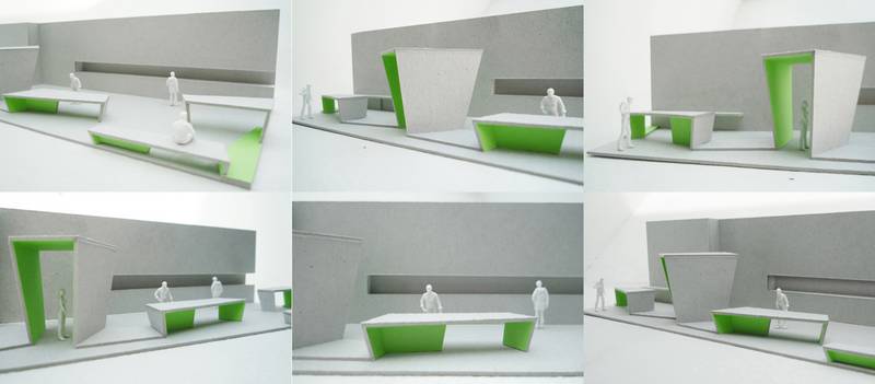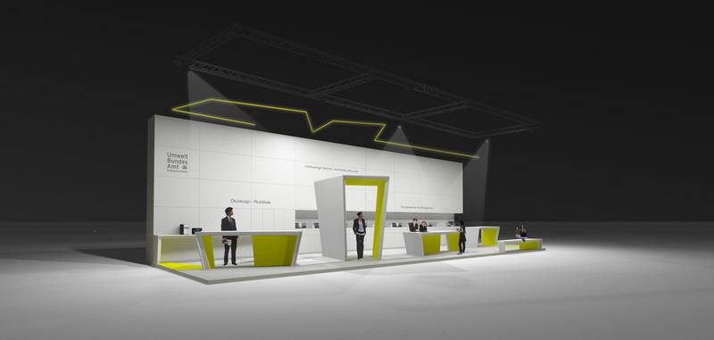 Der konzipierte Messestand stellt das Umweltbundesamt als einen Impulsgeber für den Umweltschutz inhaltlich und formal dar. Das Hauptelement ist eine modulare Medien- und Funktionswand, die als Stauraum und Ausstellungsfläche nutzbar ist. Additiv können fünf Kommunikationselemente frei platziert und neu kombiniert werden: Infothek, Medienraum, Medientisch, Café - Bar, Sitzelement. Die räumlich und funktional freie und offene Struktur bietet viele Aktionsmöglichkeiten. Als mediale und interaktive Kommunikationsebene kreiert, werden neueste Informations- und Kommunikationstechnologien bezogen auf Energieverbrauch und Ressourcenbelastung erfahrbar. Der Energieverbrauch des Stands wird digital visualisiert und als interaktiv - virtueller Rundgang zugänglich. Durch seine Form und Farbe weist der Messestand einen hohen Wiedererkennungswert auf. Das grau-grün orientiert sich am Corporate Identity des Bundesumweltamtes. Alle verwendeten Materialien weisen den Gütesiegel „Blauer Engel“ auf, sind ökologisch nachhaltig und wieder verwendbar. | Entwurf + Werkplanung + Ausschreibung | 2010