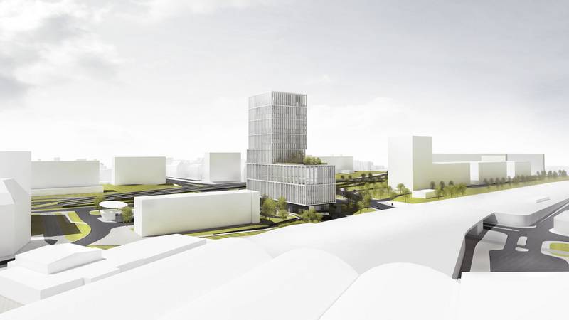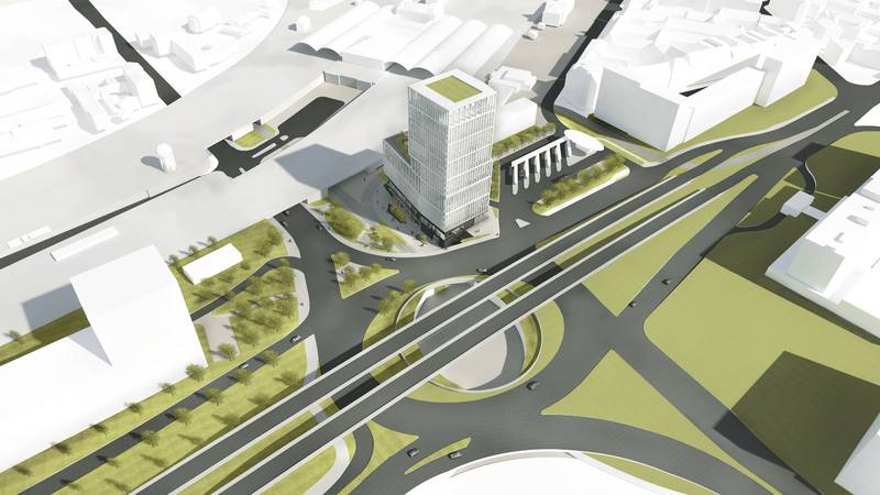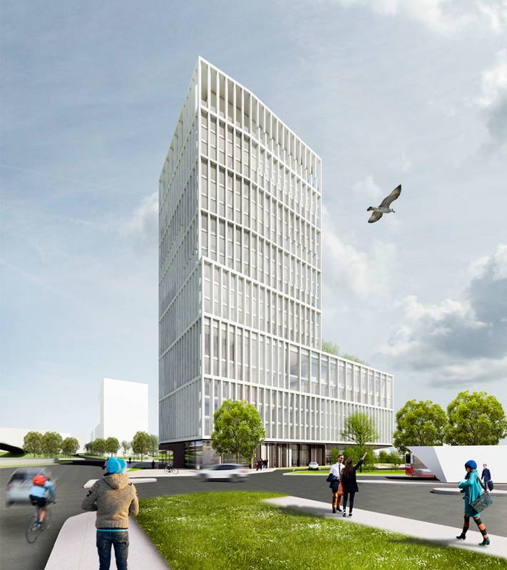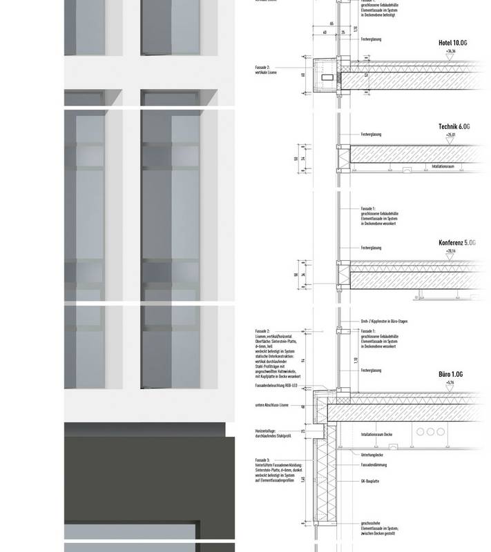 Gestaltungskonzept: Der neue Baukomplex am Riebeckplatz ist als Landmarke der Stadt Halle modelliert und nimmt städtebauliche Wegebeziehungen, Sichtachsen und unterschiedlichste bauliche Zusammenhänge auf. Die Fassade gliedert sich bezogen auf den Baukörper vertikal, feinsinnig und differenziert über geometrisch gleichmäßige Lisenen. Sie sind nach Himmelsrichtung und Funktionszusammenhängen, nach Baukörperteilen und Grundrisskonfigurationen unterschiedlich angeordnet. Es ist ein variables Fassadenbild sowohl für eine attraktive Tag- als auch Nachtwahrnehmung entworfen worden - eine formale und mediale Interaktion für die zukünftige Stadt Halle. Die künstliche Lichtinstallation an der Fassade, die über die Lisenen projiziert wird, schafft einen Symbolwert für die Stadt Halle. Es ist eine abstrakte, dynamische Fassadenbeleuchtung angedacht. Sie dient der Orientierung, transportiert Stimmung und schafft einen Mehrwert für die Kommune als Medienstadt. Eine entsprechende Lichtsteuerung kann z.B. Händels Halleluja als Muster auf der geplanten Fassade darstellen. Die Lisenen stellen über die Nutzung erneuerbarer Energien das Potential für die Schaffung einer positiven Energiebilanz des Gebäudes dar und sind damit ein wichtiger integraler Baustein. Ein stadträumlich erlebbarer, kommunikativer, öffentlicher Raum wird in den Sockelgeschoßen, wie auch im Dachgarten und der Skybar angeboten und schafft gleichzeitig ein menschliches Umfeld. Der Hauptbahnhof und der neue Gebäudekomplex werden in erster Linie für den Fußgänger und Radfahrer über einen neuen, positiven Raum mit dem Stadtraum verbunden. Die Grundrisse des Neubaus sind, bezogen auf diese Ziele, modifiziert worden. Arbeitsgemeinschaft mit Großmann Architektur, Michael Peitz Architekten und Plantraum Freiraumarchitekten.